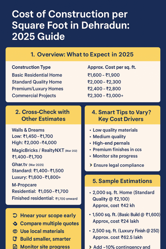 If you’re planning to build in Dehradun in 2025, the average construction cost hovers between ₹1,600 and ₹2,500 per sq. ft., influenced largely by material quality, location, and building type. Here’s how that breaks down: